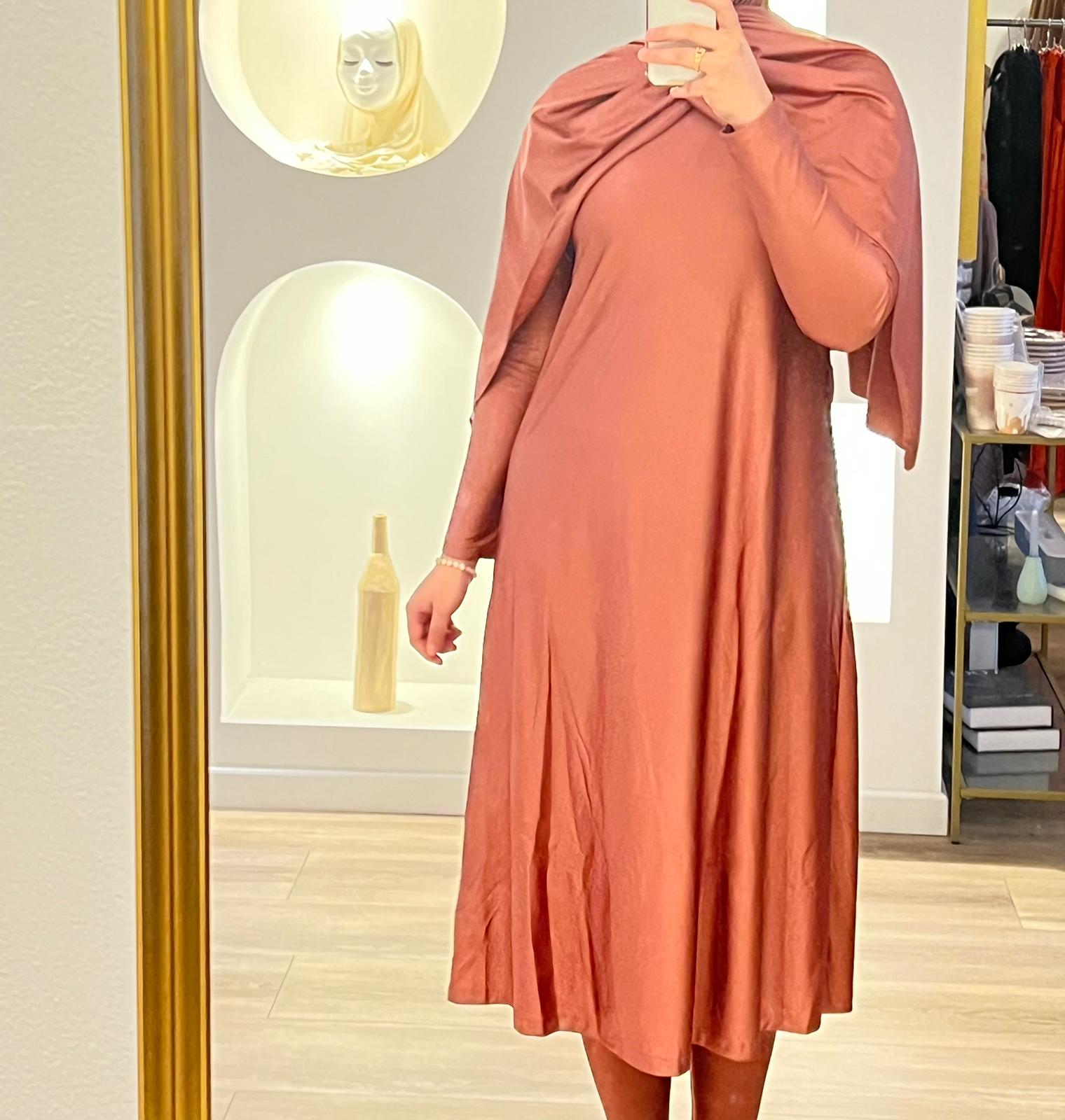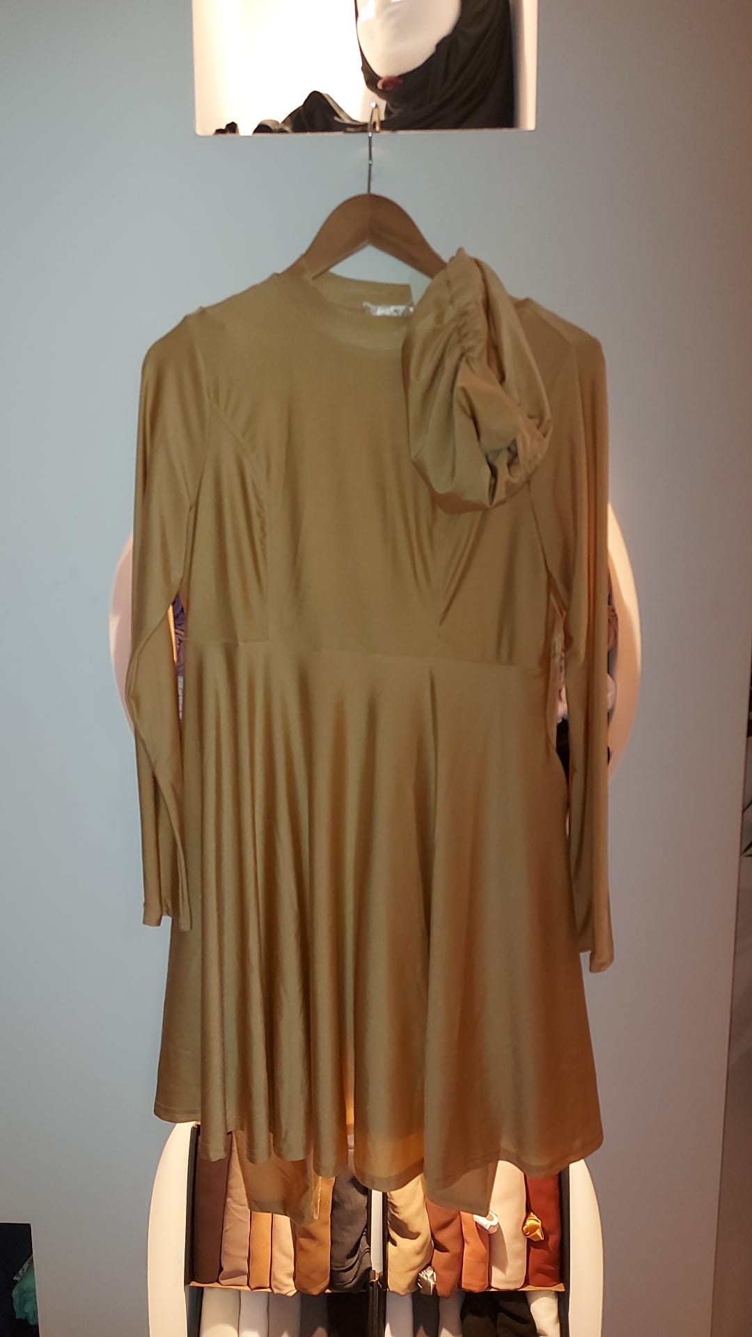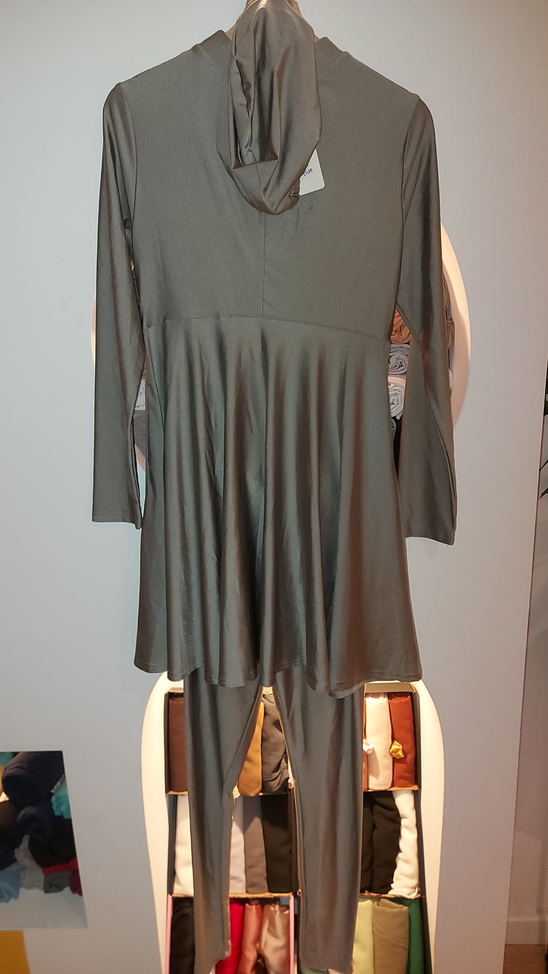 De burkini is van speciale badstof. Het jurkje valt tot net boven de enkels en heeft een lange kraag. . De leggin is ook van badstof en heeft een band als sluiting. Ook is er een hoofddoek sjaal van badstof.